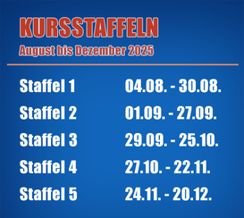 Hier findet ihr den Stundenplan für die nächste Staffel (4 Wochen). Die Kurse sind als Gesamtpaket mit den 4 Terminen als eine Einheit buchbar. In dem Bild seht ihr den Überblick über die 5 Staffeln ab August 2025.